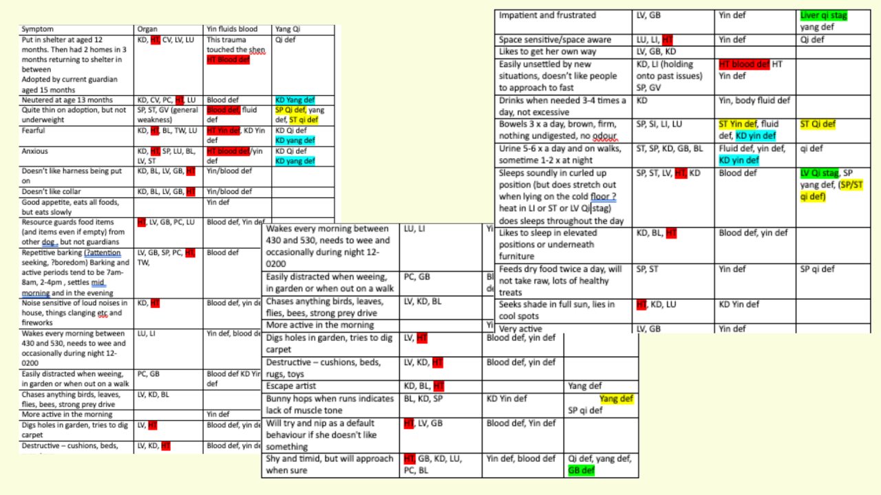 I then link these to all the organs applicable, yin, yang and 4 vital substances of Blood, Fluids, Qi and Essence. As you can see from the amount of highlighted red that Heart is the organ that is clearly standing out, which leads to the conclusion that Heart is her root organ.