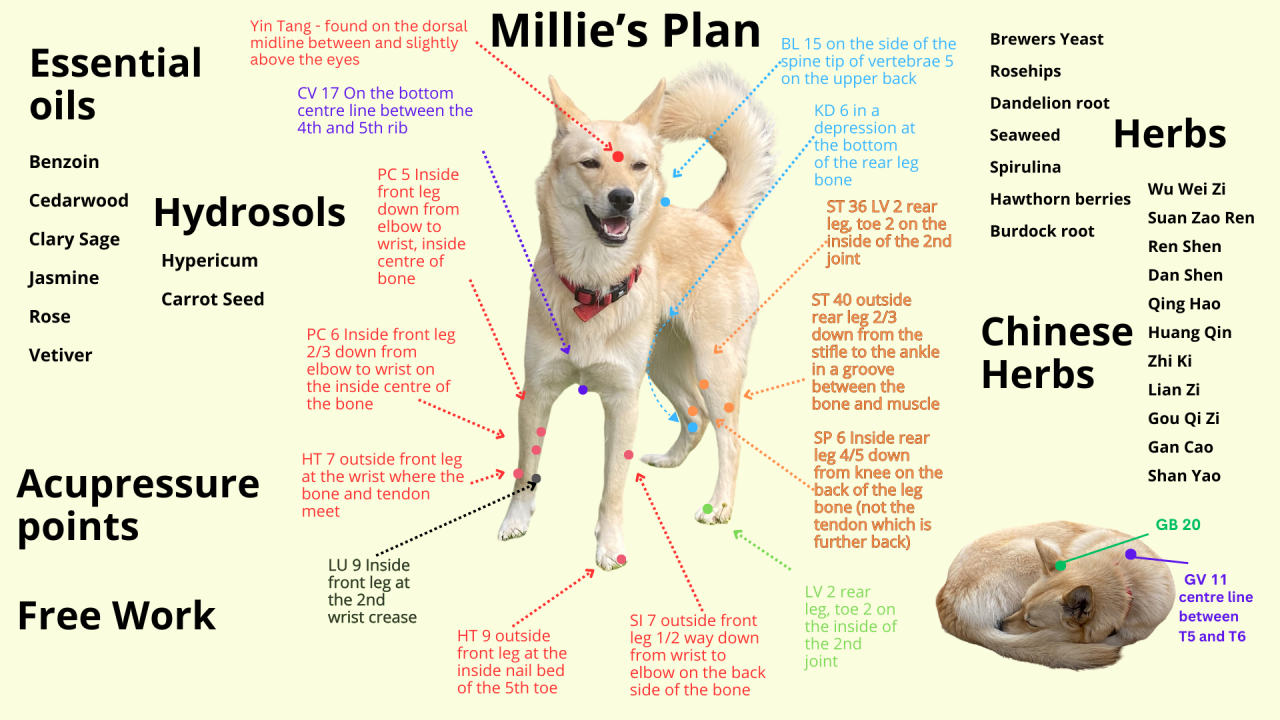 This whole plan was followed 4-5 times a week for 4 months and still continues today with herbs and oils being offered 1-2 times a week. Millie was touch sensitive and did not tolerate any acupoints on her limbs, but did like the head, chest and back points. Like all therapies they are offered on a self-selection basis. And of course, Free Work was part of the plan. It has been wonderful to see a traumatised, fear-aggressive dog learn to feel safe and adapt to her new home.